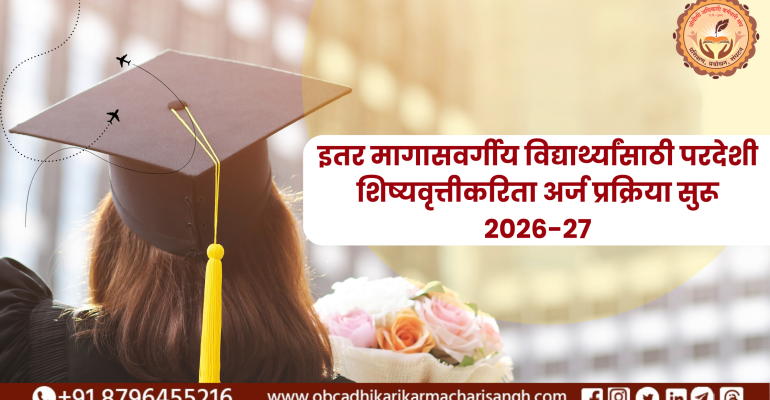 इतर मागासवर्गीय विद्यार्थ्यांसाठी परदेशी शिष्यवृत्तीकरिता अर्ज प्रक्रिया सुरू महाराष्ट्र शासनाच्या इतर मागास बहुजन कल्याण विभागामार्फत इतर मागासवर्गीय (OBC), विमुक्त जाती व भटक्या जमाती प्रवर्गातील विद्यार्थ्यांसाठी परदेशात उच्च शिक्षणासाठी विदेशी शिष्यवृत्ती योजनेअंतर्गत 2026-27 वर्षासाठी अर्ज प्रक्रिया सुरू करण्यात आली आहे. परदेशातील नामांकित विद्यापीठांमध्ये उच्च शिक्षण घेऊ इच्छिणाऱ्या विद्यार्थ्यांसाठी ही योजना एक मोठी संधी मानली जात आहे. […]